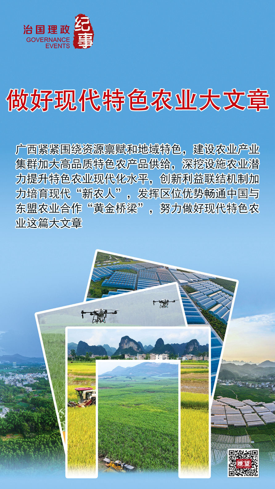 ◇2017年4月,习近平总书记在广西壮族自治区考察时提出:“加强农业科技创新和推广,夯实粮食安全基础,拓展农业产业链,发展高质量高附加值产品。要着力发展农产品,提高农产品质量效益和竞争力。” 农业作为一个整体。要支持新型农业企业,开发农民新装备,提高农业生产力。全力打造现代特色农业。 ◇ 2021年12月,农业农村部与广西壮族自治区签署《全面推进乡村振兴现代特色农业质量建设合作框架协议》 (2021-2025).《农业农村部关于广西壮族自治区将围绕建设特色优质现代农业,在夯实产业发展基础、提升产业链现代化水平、完善贸易体系等六方面开展密切合作。广西壮族自治区聚焦区域资源和特色,打造农业产业集群,增加优质特色农产品供给,挖掘设施农业潜力,提升特色农业现代化水平,创新参与机制,培育现代“新农民”,发挥区位优势,破解发展障碍。 打造中国与东盟农业合作“金桥”,做好现代特色农业。 ◇广西壮族自治区凭借丰富的自然资源和差异化的气候,大力发展因地制宜,形成了以“糖碗”、“菜篮子”、“果盘”、“肉碗”“四个字”为代表的特色农业产业集群。 ◇截至2024年底,广西壮族自治区累计认证“桂兆”农业品牌641个,总产值超过1600亿元,品牌总价值超过5000亿元。 ◇2020年以来,广西壮族自治区产区共建设农产品冷藏保鲜设施4873个,储藏能力约293万立方米。果蔬的新鲜度和保质期大大提高。 FR productsescos 的平均保费收入现在比没有相关设施时高出约 25%。 ◇目前,广西农业农村人员总数已突破百万,培养了2800多名现代青年农民,乡村产业振兴带头人2100余名,农业经营管理者3200余名。 ◇目前菠萝蜜、火龙果、木薯、苦瓜等广西壮族自治区的50项标准,包括水果、木薯、苦瓜等生产加工技术规程,均为东盟互认标准。 文字| 《寻找》周刊记者段贤柱、何伟、黄庆刚全国每三杯糖就有两杯广西出产,几乎七分之一的水果产自广西。世界上每十朵茉莉花就有六朵产自广西。柑橘类水果、柿子、火龙果、百香果等的面积和产量均居日本第一。蚕茧产量连续20年位居全国第一……广西壮族自治区地处祖国南疆,山清水秀、光热充足、物产丰富。 G习近平总书记对广西壮族自治区发展特色现代农业寄予厚望。 2017年4月,习近平总书记在广西壮族自治区考察时指出,要“加强农业科技创新和推广,夯实粮食安全基础,拓展农业产业链,重点发展高附加值优质农产品,提高农业整体质量效益和竞争力”。 农业新技术的必要支持。组建新型农民队伍,提高农业竞争力。 “全力打造现代特色农业”。 2021年4月,习近平总书记在广西考察时强调,要立足广西独特资源,打造一系列特色农产品产业集群。资源,如森林、水果、蔬菜、牲畜和糖。 2023年12月,习近平总书记在广西壮族自治区考察时,重申了该地区发展现代特色农业的优势。 “广西雨热充沛,农业生产条件良好。发挥广西丰富而特色的森林、水果、蔬菜、畜牧、糖业等资源优势,实现大农业,必须大力发展具有广西特色的现代农业。” “桂豪”品牌享誉全国。”2021年12月,农业农村部与广西壮族自治区签署《现代特色农业质量建设合作框架协议,全面推进农业农村现代化建设《推动乡村振兴(2021-2025年)》。农业农村和广西壮族自治区将围绕建设特色优质现代农业,在夯实产业发展基础、提升产业链现代化水平、完善贸易体系等六个方面开展密切合作。《广西壮族人民政府指导意见》 《自治区关于加快广西现代特色农业高质量发展的意见》、《广西壮族自治区加快现代农业设施化发展实施方案(2023-2025年)》……广西壮族自治区围绕资源禀赋和区域特色,出台实施了一系列政策文件,建立农业产业集群,加大农业产业化力度 供应优质特色农产品,深挖农民潜力城市农业提高特色农业现代化水平,创新培育现代“新农民”参与机制,利用区位优势解决中国—东盟农业合作“金桥”障碍,努力做好现代特色农业工作。 2024年,广西壮族自治区农林牧渔业总产值比上年增长4.3%,其中园艺水果产值增长5.0%。蔬菜、食用菌产量增长4.4%。甘蔗、蚕桑、秋冬蔬菜、罗汉果、茉莉花(茶)、水牛/奶牛、近江牡蛎等生产规模全国最大。发展广西特色现代农业,有利于做强做大脱贫攻坚成果,促进乡村振兴振兴,为全国重要农产品稳定生产供应作出贡献,有力促进广西与东盟农业合作与交流。广西兴业县大坪山镇三联村甘蔗种植基地,村民们在照料甘蔗叶(资料图) 曹一鸣/本刊供图 一朵生于沃土的花,孕育了广西的“四子” 广西地区有“八山、一水、一田、一海”。热带和亚热带气候并存,全境以南回归线为标志,雨量充沛,光热充足。是全国为数不多的适合农林牧渔业综合发展的地区之一。广西壮族自治区凭借丰富的自然资源和独特的气候,形成了具有特色的农业产业集群代表因地制宜地推出“糖碗”、“菜篮子”、“果盘”、“肉碗”等“四字”。立足要素发展不平衡,科学组织特色农业产业群。太农一号、金皇冠、桂七波……今年白次郎芒果上市,果香诱人。余江流域东西绵延130公里,南北宽约20公里。其独特的地形环境和亚热带南方季风气候可与海南岛、西双版纳相媲美,是芒果种植的天然良港。百星芒果的成熟期为6月至9月,夏季可以品尝到清爽可口的芒果。 “我们正在千方百计打造全国最大的