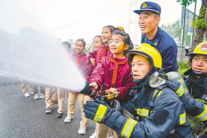 11月7日,武汉市武昌区中山路小学紫渡二分局中山路消防救援站的消防队员走进校园,为孩子们上了一堂生动有趣的消防安全“入门课”。今年11月9日是第34个全国防火日,主题是“消防把生命放在第一位:安全用火用电”。现场,消防官兵充当“安全教官”,以学校火灾为例,深入浅出地讲解火灾原因、拨打119的规则、紧急情况下的疏散方法等基础知识。消防员还鼓励孩子们参与穿上消防装备并一起使用高压水枪来模拟消防演习。 (图片提供:湖北日报全媒体记者魏锐,通讯员应作樵、张琳)