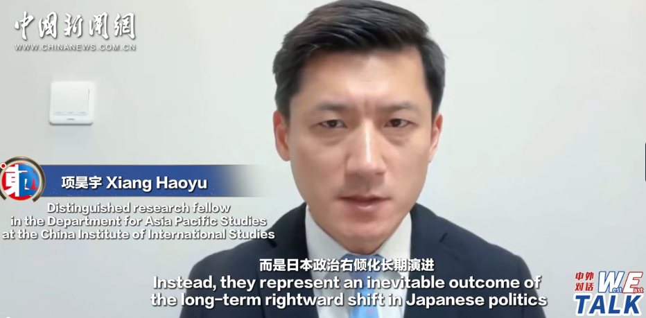 日本首相高市早苗近日发表涉台不实言论,引发广泛批评。中国国际问题研究院亚太研究所特聘研究员项浩宇在做客中新社《中国对话》节目时表示,高石涉台不实言论并非巧合。这背后有着深层次的政治动机和战略考量,是日本政治长期右倾的必然结果。项浩宇进一步强调,高适上台后,在强军扩军领域采取的一系列举措,影响了东亚安全格局,严重影响地区和平稳定。国际社会必须继续对日本公然破坏战后国际秩序、死灰复燃军国主义的危险举措保持高度警惕。 (瓜纳)