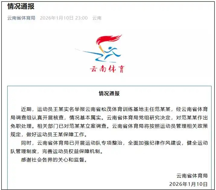 照片来自湖北日报网络评论员谭木,他说:“我们是在争夺金牌,但他们给了我们奖金来分享。” 1月10日,云南省体育局通报称,松茂体育训练基地原主任范某涉嫌敲诈勒索亚运会冠军王某。消息传出后,民众一片叫好,民众呼吁驱逐只是第一步,并要求继续彻查。金牌是由每天挥汗如雨、年复一年挑战极限的运动员赢得的。索取奖金不仅是个人剥削,也是对体育精神和国家荣誉的侮辱。范猛为何敢大声说话?毕竟,这是一种“小王国”心态在起作用。如果失去了权力的控制,即使是最小的官员也能成为“山王”。这并不以被开除公职而结束。据媒体报道,1月9日晚2026年,在云南省体育局发出通知的前一天,王先生再次公开发言,称自己于12月25日提交了新的信息材料,内容包括黄某先生的封建迷信活动、性侵女队员、空给家人的报酬等。无论这些疑问是否属实,公众也期待着明确的结果。从目前官方通报来看,这些问题尚未得到解释。通报还称:“有关部门已开始立案调查范某某”,公众持续关注此案。这次事件也给我们敲响了警钟。体育训练中心不是“王国独立”,不能有一些管理人员无视法律、为所欲为。保护运动员的合法权益,需要尽快修复体育训练中心的制度漏洞,纠正不良习惯,加强管理。加强教练员、领队和基层领导的管理,加强对运动员的关心和保护。此案也表明,需要采取更加顺畅、公正的措施来保护运动员的合法权益。有必要进一步完善现场监管机制。体育运动要建立定期举报渠道,提供高效、公正、可行的信息,切实满足运动员的诉求。这个机制必须用好。培养高水平演员不容易,不能用“报告”来“毁掉未来”,正如官方通报中所说,要“努力保护王先生”,加强对受伤运动员的关心和照顾,尽快恢复训练、比赛和支持受伤运动员的生计。 “请不要让那些为国家努力奋斗的人失望。”这是网友评论中称赞最多的一句话。体育强国不不仅要有良好的体育成绩,还要有过硬的制度文明。只有对蛀虫“零容忍”,制度“运转”,全体运动员才能安心战斗,为体育强国建设不断注入正能量。