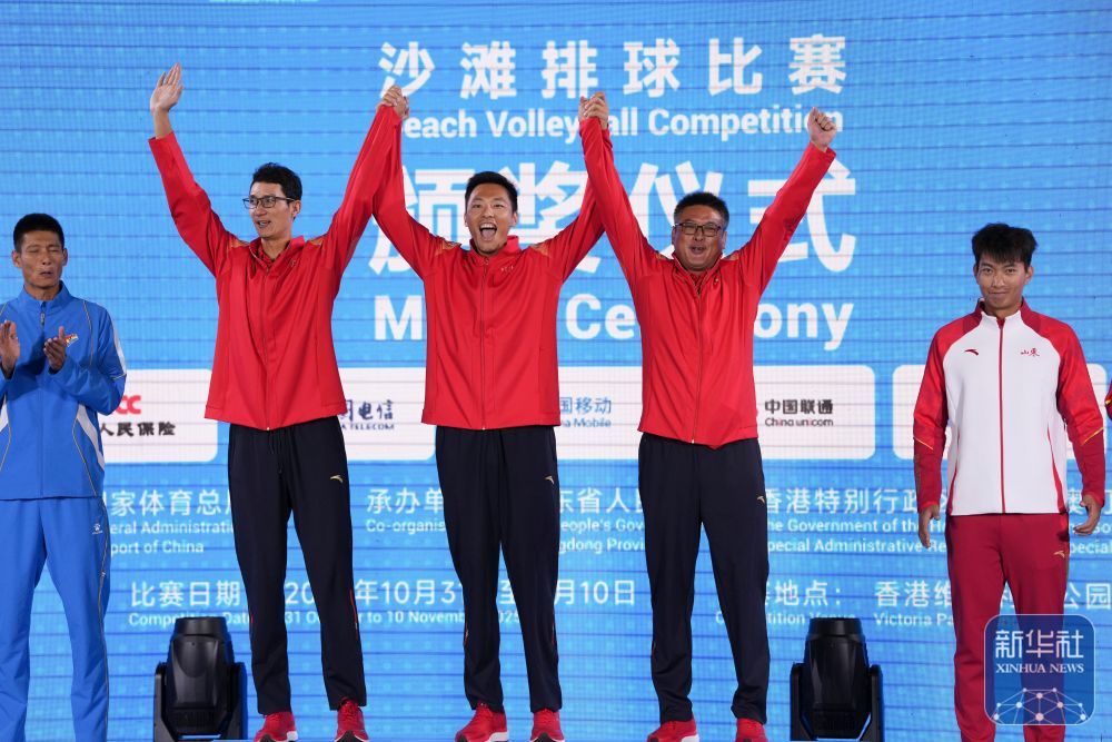 11月10日,第十??五届全国沙滩排球男子金铜牌锦标赛在香港举行。 ^ 江苏队获胜队吴嘉欣(左二)、周朝伟(中)及其教练在颁奖典礼上。 ^ 赛后,江苏队球员吴嘉欣(右)/周超伟庆祝胜利。在金牌争夺战中,他们以2-0战胜了辽宁队的李卓新/雪涛队。 ^ 江苏队吴嘉欣/周超伟(左)在比赛中。在金牌争夺战中,他们以2-0战胜了辽宁队的李卓新/雪涛队。 ^ 山东队球员王燕伟在比赛中庆祝进球。在铜牌争夺战中,他与队友杜红军以2比0击败上海队洪家俊/李杰,获得第三名。 ^ 配对期间辽宁队的李卓新(右)。他与队友薛涛在金牌争夺战中以2-0不敌江苏队吴嘉欣/周超伟,获得亚军。^ 辽宁队薛涛(右)在比赛中。他与队友李卓新在金牌争夺战中0-2不敌江苏队吴嘉欣/周超伟,获得亚军。 ^ 辽宁队李卓新在比赛中出现失误。他与队友薛涛在金牌争夺战中以2-0不敌江苏队吴嘉欣/周超伟,获得亚军。 ^ 获得银牌的辽宁队薛涛(左)看着江苏队吴嘉欣获得的金牌。 ^上海队李杰(右)在比赛中。他和队友洪家军在铜牌争夺战中0-2不敌山东王燕伟/杜红军队。 ↑上海队李杰(右)在比赛中。他和队友洪家军在铜牌争夺战中0-2不敌山东王燕伟/杜红军队。新华社记者吴璐供图。