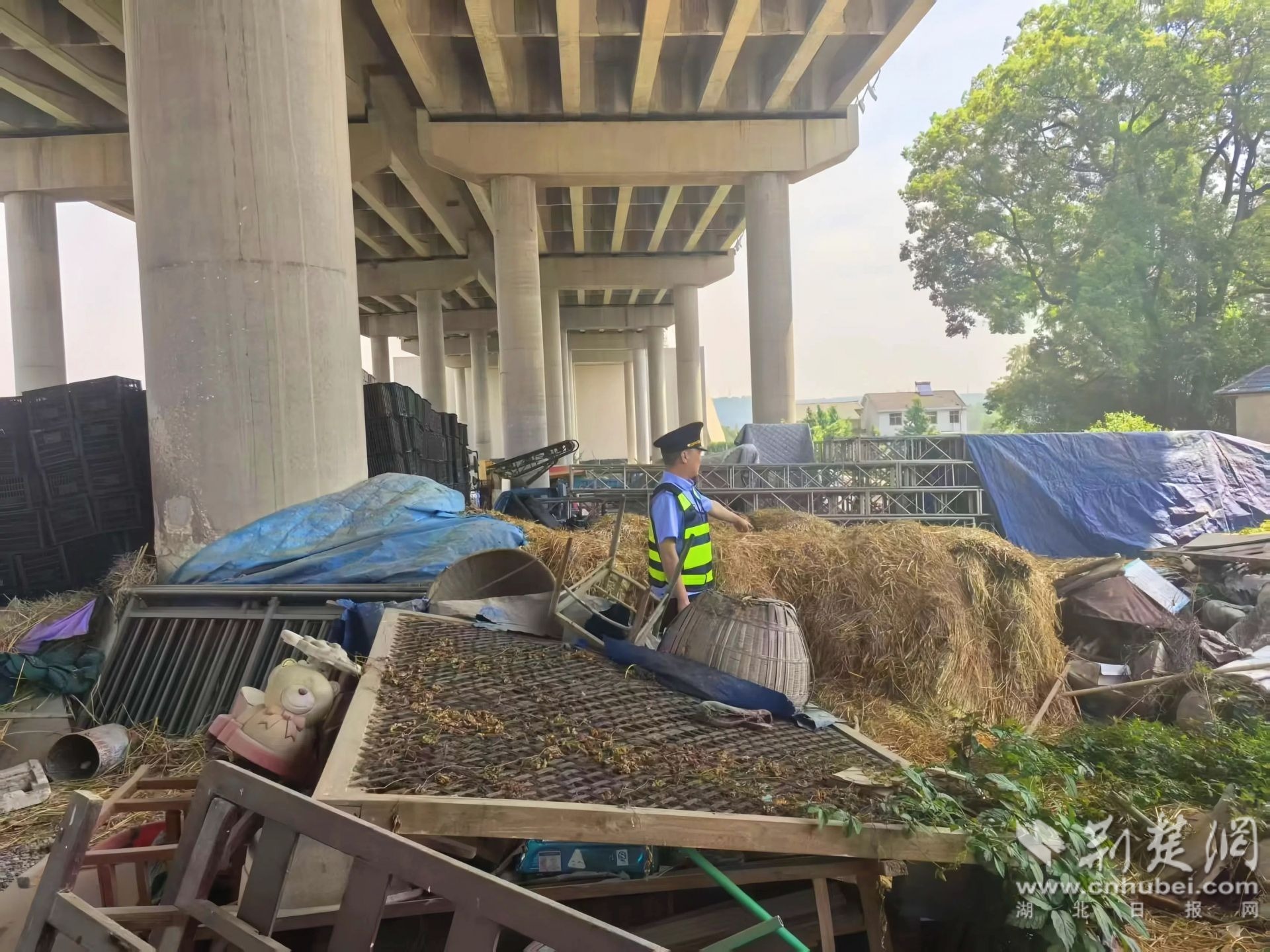 今年3月,执法部门公路管理八支队四大队人员在例行检查时发现宜渡桥下有异常情况。 “那里有成堆的稻草、木头和钢结构,塑料篮、废旧机械、下水道和水泥袋随意堆放。”公路管理第八支队第四大队队长刘云贵回忆,桥下数千平方米的空间被一名商人和八名村民“瓜分”。这些碎片一旦着火,后果将十分严重。